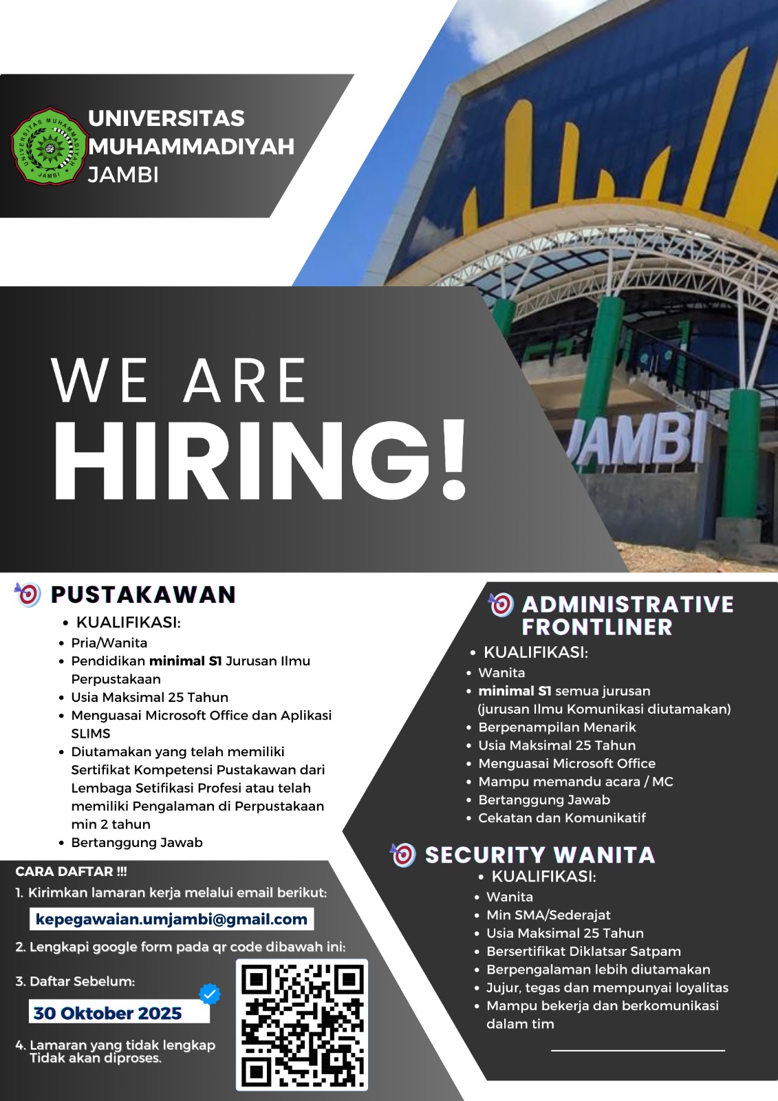 LOWONGAN KERJA POSISI PUSTAKAWAN, ADMINISTRATIVE FRONTLINER, SECURITY WANITA, UNIVERSITAS MUHAMMADIYAH JAMBI